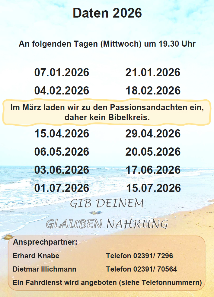 Wir laden herzlich ein, gemeinsam in der Bibel zu lesen und sich darüber auszutauschen. Im gemeinsamen Gespräch können Interessierte/wir den Schatz der Heiligen Schrift und den aktuellen Bezug zur heutigen Lebenssituation entdecken. Die Abende werden gestaltet von Erhard Knabe, Dietmar Illichmann und anderen. Jeder ist herzlich eingeladen.